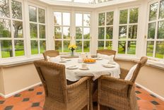 The entrance hall leads to a lovely sitting room which comfortably seats seven people at one end, and has a dining area at the other. There is a bright conservatory with a table and chairs, which provides the perfect spot to enjoy a leisurely breakfast, whilst enjoying the wonderful outlook over the beautiful large garden and the fields beyond.